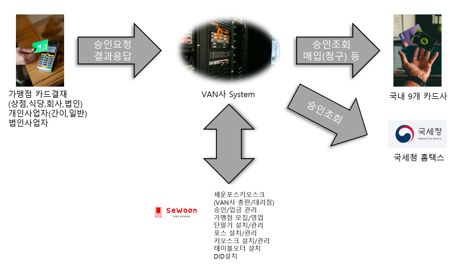 신용카드를 제시할 때 신용카드사와 연계하여 고객들의 신용카드를 조회하고 승인 하는 서비스를 제공함과 동시에 부가적으로